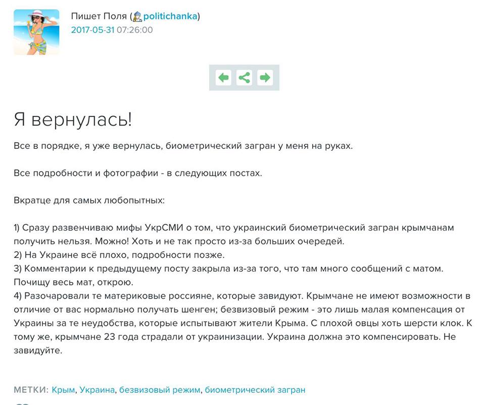 При утреннем обходе наткнулась на весьма интересный пост от крымчанки, русской патриотки, истинной дочери офицера и по совместительству топ-блогера ЖЖ о том, как быстро и просто она получила… украинский биометрический паспорт. Параллельно барышня выложила детальный план своего будущего путешествия в Европу, который предполагает многоуровневую комбинацию и жонглирование украинским и российским паспортами.