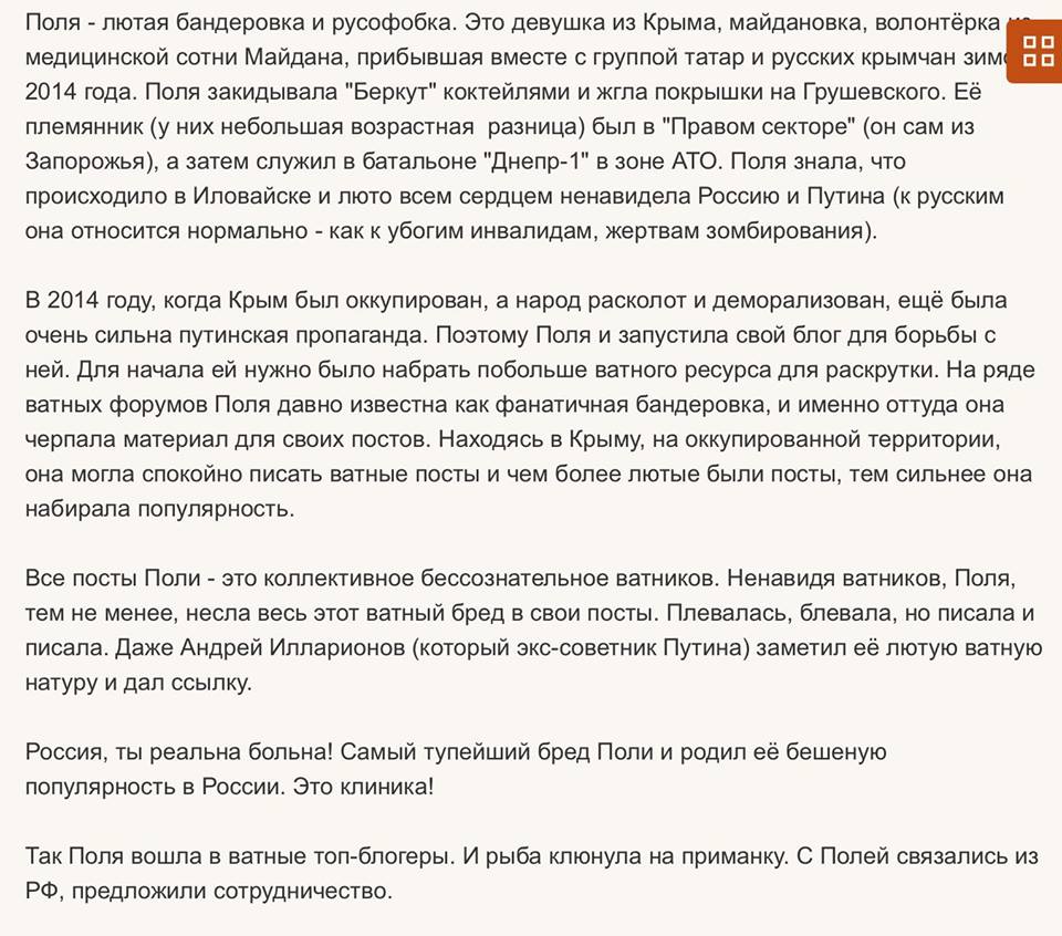 Крымская сказочница на самом деле оказалась троллем и давно рассекреченным своими же побратимами агентом. Не буду описывать все вехи её биографии. Пара скринов прекрасно иллюстрирует образ авторитетного блогера.