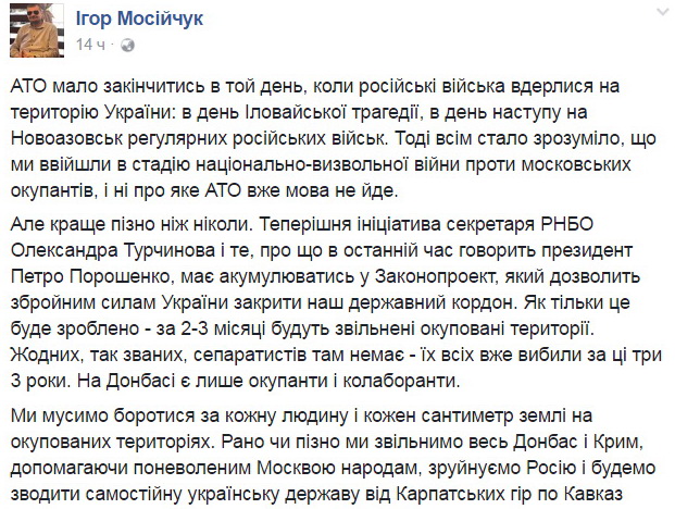 «Как только это будет сделано — через 2 — 3 месяца будут освобождены оккупированные территории. Никаких так называемых сепаратистов там нет — их всех уже выбили за эти три года. На Донбассе только оккупанты и коллаборационисты. Мы должны бороться за каждого человека и каждый сантиметр земли на оккупированных территориях. Рано или поздно мы освободим весь Донбасс и Крым, помогая порабощенным Москвой народам, разрушим Россию и будем строить самостоятельное украинское государство от Карпатских гор до Кавказа», — угрожает Мосийчук. Источник