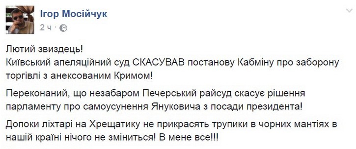 «Лютый звиздец! Киевский апелляционный суд ОТМЕНИЛ постановление Кабмина о запрете торговли с аннексированным Крымом! Убежден, что вскоре Печерский райсуд отменит решение парламента о самоустранении Януковича с должности президента!