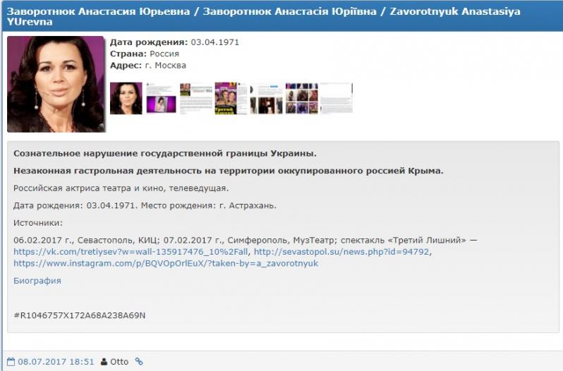 Актёры Дмитрий Дюжев, Анастасия Заворотнюк, Евгения Добровольская и Даниил Спиваковский были включены в список за «сознательное нарушение государственной границы Украины» и «незаконную гастрольную деятельность» в Крыму.