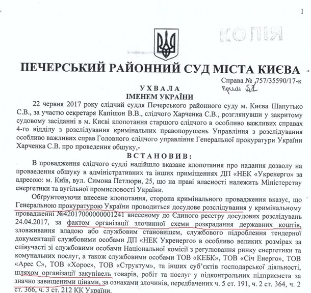 "Вчера мы писали о миллиардах гривен, которые мы сэкономили на внутренних и внешних тендерах... А сегодня мы увидели решение самого демократичного суда Киева – Печерского районного суда города Киева, в которой говорится о том, что Генеральная прокуратура Украины осуществляет досудебное расследование "организации преступной схемы разворовывания государственных средств, злоупотребления властью или служебным положением ... путем организации закупок товаров, работ и услуг на подконтрольных предприятий ПО ЗНАЧИТЕЛЬНО ЗАВЫШЕННЫМ ЦЕНАМ", – говорится на странице Укрэнерго в Facebook. Источник