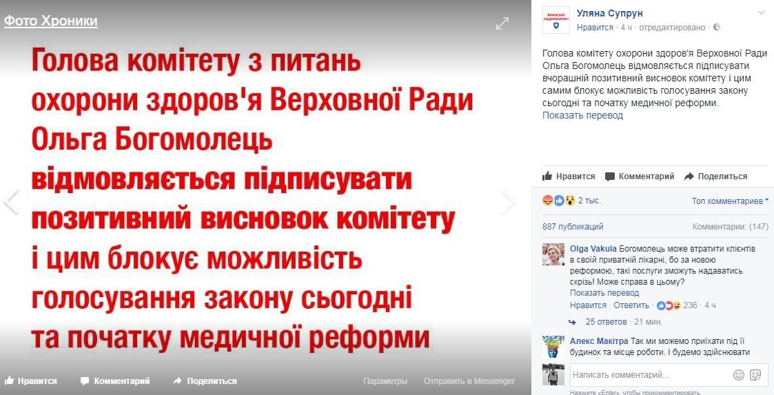 Только Супрун человеческого языка не понимает. Ей, что в лоб, что по лбу! Реформе быть, и никаких разговоров. Досталось и главе комитета Рады по вопросам здравоохранения Ольге Богомолец, по которой Супрун «прошлась» в Facebook. Видите ли, Богомолец не пожелала ставить подпись под «позитивными» выводами комитета и дать ход реформе.