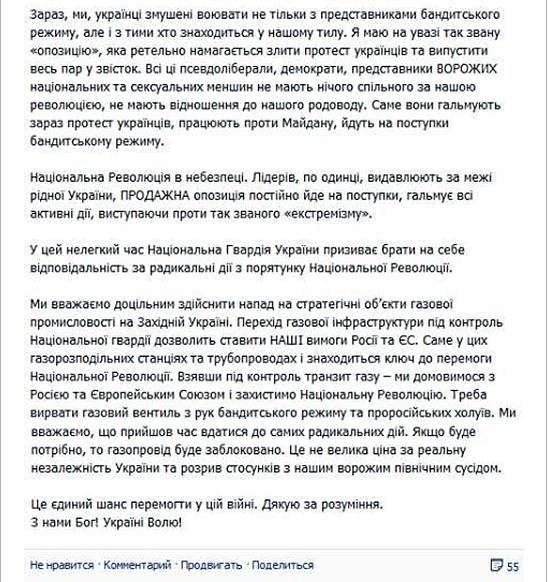 «Мы считаем целесообразным напасть на стратегические объекты газовой промышленности на Западной Украине. Переход газовой инфраструктуры под контроль Национальной гвардии позволит ставить наши требования России и ЕС. Именно в этих газораспределяющих станциях и трубопроводах и находится ключ к победе Национальной революции».