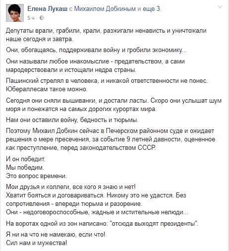 «Михаил Добкин сейчас в Печерском районном суде и ожидает решения о мере пресечения, за событие 9 летней давности, оцененное как преступление, перед законодательством СССР. И он победит. Мы победим. Это вопрос времени. На воротах одной из зон написано: "отсюда выходят президенты". Я ни на что не намекаю, если что! Сил нам и мужества!», - написала она.