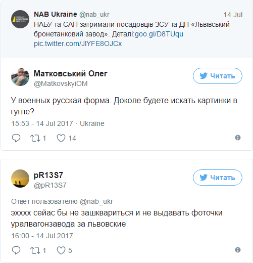 Национальное антикоррупционное бюро Украины (НАБУ) проиллюстрировало в Twitter новость о задержании руководителей Львовского бронетанкового завода фотографией с "Уралвагонзавода". На фото изображены российские танки Т-90.