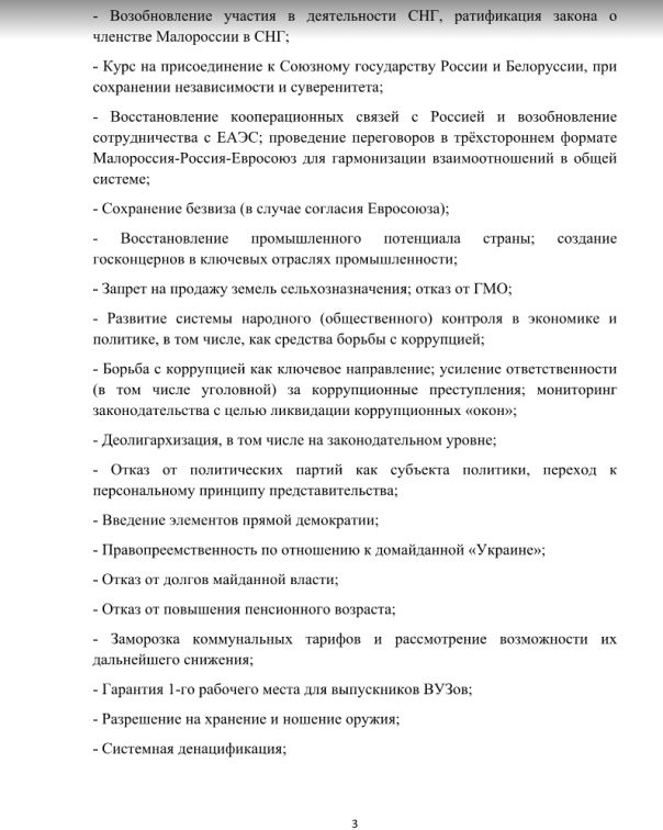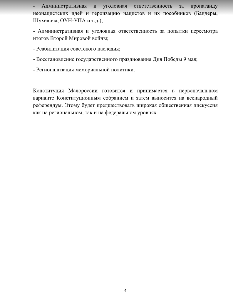 Предлагается, что Малороссия станет федеративным государством с широкой автономией. В ведении центральных органов власти должны остаться вопросы федерального бюджета, армии, спецслужб.
