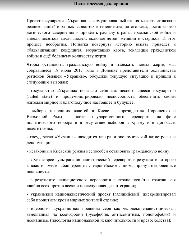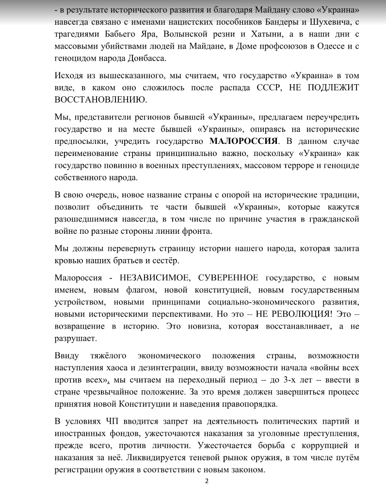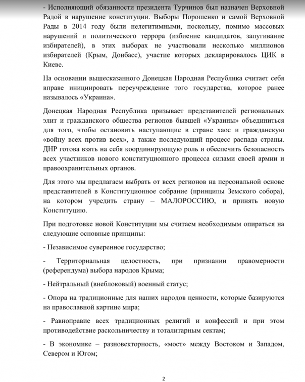 "Мы, представители бывшей Украины, заявляем об учреждении нового государства, которое является правопреемницей Украины. Мы согласны в том, что новое государство будет называться Малороссией, так как само название Украина себя дискредитировало. Столицей Малороссии становится город Донецк", — заявил Тимофеев, зачитывая конституционный акт.