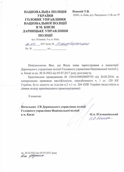 Попова также обнародовала ответ Дарницкого районного управления полиции Киева, согласно которому уголовное производство, открытое 26 мая 2016 года по ст. 129 (угроза убийством) Уголовного кодекса, закрыто в связи с отсутствием состава преступления. Источник
