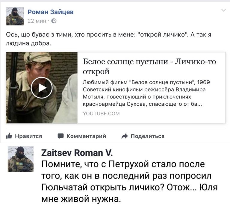 Но гроза «сепаратистов», «ватников», журналистов и личного состава ВКС РФ в Сирии, выкладывающий в открытый доступ их личные данные и фото, не спешит демонстрировать своё лицо. Интересно, почему?! Неужели боится?! Или есть другая причина?! Например, что Роман Зайцев — это вымышленное имя и… вымышленный персонаж. Допускаю, что за громким постом «директор Миротворца» (ну прям директор «Аненербе») скрывается десяток-другой рабов интернет-плантации, активно топящих за Порошенко и перманентно хвастающихся своими достижениями в области выявления антиукраинских элементов.