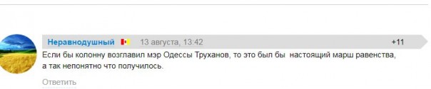 Не всем понравился Марш равенства с котиками и призывами проявить понимание. Националисты и некоторые граждане негативно восприняли попытку «радужных» активистов навязать им свои взгляды на жизнь. Правда, руководство города не протестовало и, как отметил один из пользователей Сети, на «празднике» очень не хватало мэра Одессы Труханова.