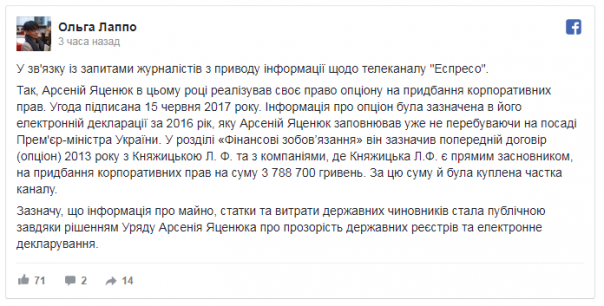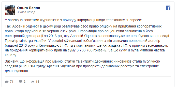 «Арсений Яценюк в этом году реализовал свое право опциона на приобретение корпоративных прав. Соглашение подписано 15 июня 2017. Информация об опционе была указана в его электронной декларации за 2016, которую Арсений Яценюк заполнял уже не находясь в должности премьер-министра Украины», – написала Лаппо.