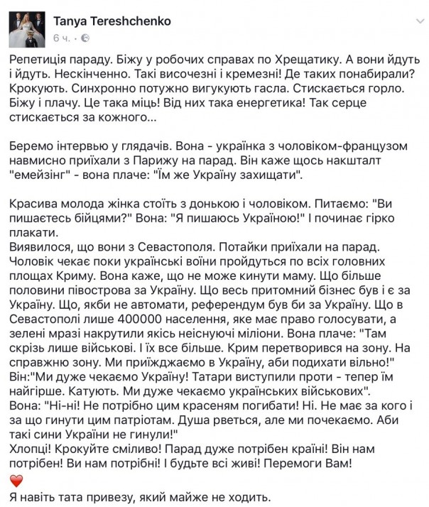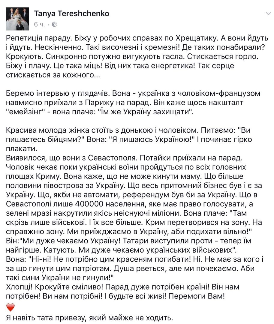 «Репетиция парада. Бегу по рабочим делам по Крещатику. Они идут и идут. Бесконечно. Такие высокие и крепкие! Где таких набрали? Шагают. Синхронно мощно выкрикивают лозунги. Сжимается горло. Бегу и плачу. Это такая мощь! От них такая энергетика! Так сердце сжимается за каждого…