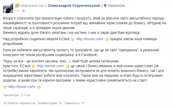 "Когда вы увидите масштабность проекта, то поймете, что это не сайт-"однодневка", а реальный конкурент не только российским соцсетям, но и Facebook", — написала Струмчинская. Она пообещала, что в новой соцсети будет легальный доступ к контенту — музыке и кино. Кроме того, "ЄСвоє" должна стать бизнес-соцсетью, в которой "каждый пользователь при желании сможет зарабатывать".