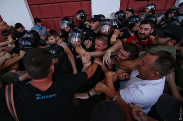Под мэрией Одессы произошла драка во время штурма из-за пожара детского лагеря, в котором погибли три девочки; полиция применила газ, передает Думская.