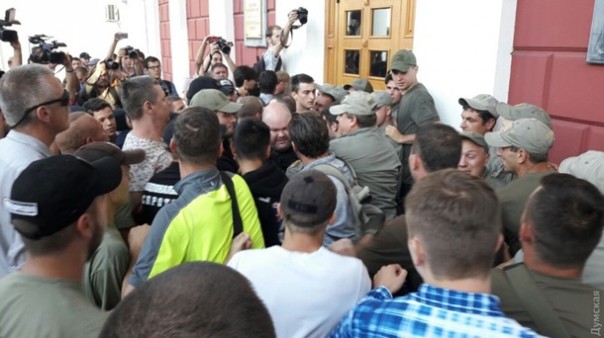 Когда люди попытались зайти в здание, произошла потасовка с муниципальной службой охраны. Разбиты входные двери горсовета. Люди обещают стоять, пока не придет мэр Одессы Геннадий Труханов.