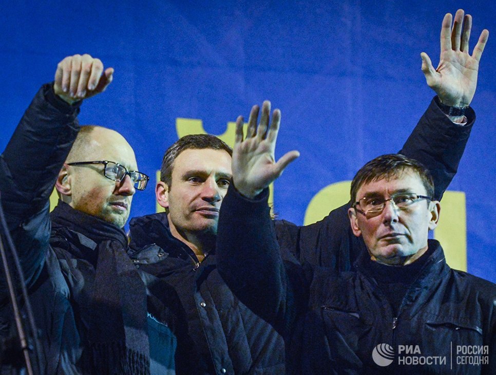 Арсений Яценюк, Виталий Кличко и экс-глава МВД Украины Юрий Луценко на митинге за вступление Украины в Евросоюз на Майдане Независимости в Киеве