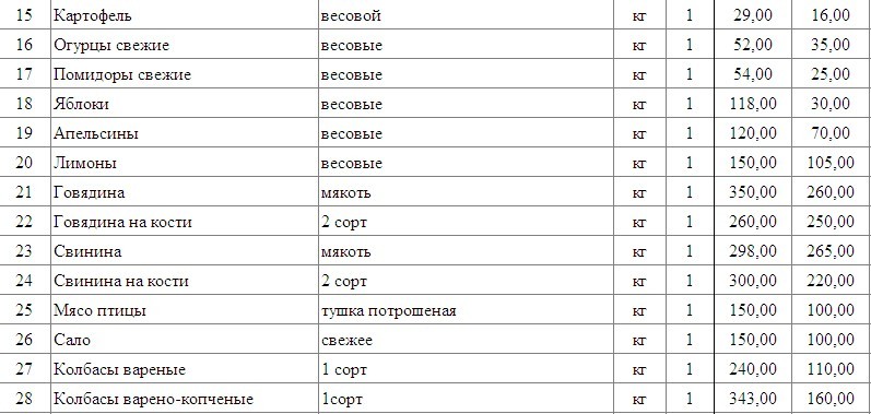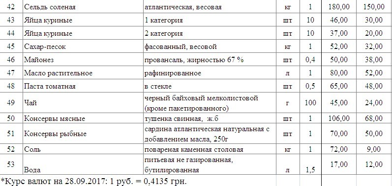 А я приведу таблицы, мониторинг цен в ДНР на 28.09 2017 года., все цены в рублях: