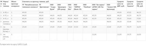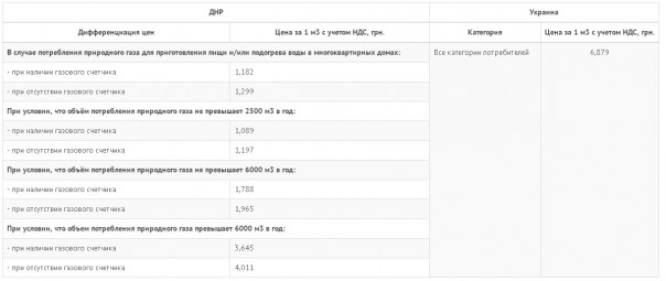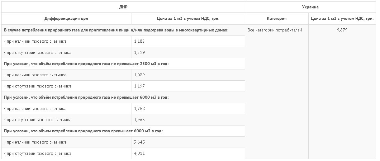 Сравнительная таблица розничных цен на природный газ для населения в ДНР и Украине