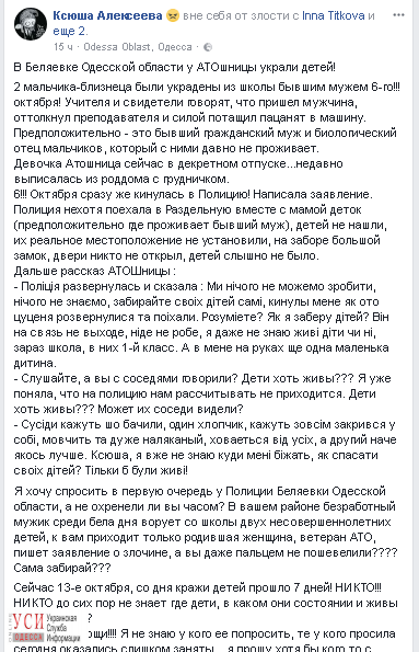 По ее словам, мать детей – участница АТО, сейчас находится в декрете. Двух ее старших сыновей-близнецов, которые ходят в первый класс, 6 октября прямо из школы без согласия матери увез их отец. В официальном браке родители мальчиков не состояли.