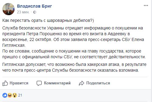 Информация о покушении на президента Украины Петра Порошенко во время его рабочего визита в Авддевку недостоверна. Об этом сообщила пресс-секретарь Службы безопасности Украины Елена Гитлянская.
