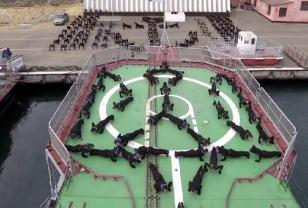 Напомним, в январе 2017 года около двух сотен будущих и действующих офицеров ВМС ВС Украины во главе с командующим ВМС ВС Украины вице-адмиралом Игорем Воронченко сформировали живые фигуры герба и якоря на причальной стенке и вертолетной площадке фрегата "Гетман Сагайдачный.