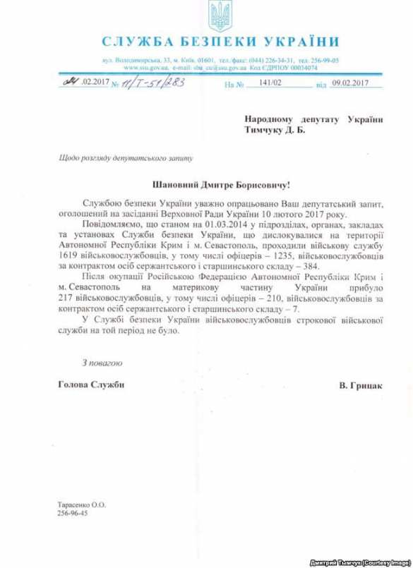 «Сообщаем, что на 01.03.2014 в подразделениях, органах, заведениях и учреждениях Службы безопасности Украины, которые дислоцировались на территории Автономной Республики Крым и г. Севастополь, приходили военную службу 1619 военнослужащих.