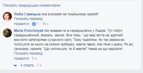 Хорошо сказала об этом одна из горожанок: «Мы живем как в средневековье во Львове. Здесь быт средневековый, мораль, обычаи. Все потому, что мэр города не способен мыслить категориями современного мира. Поэтому львовяне, которые так ревностно голосуете за него на каждых выборах, должны гавно, которое течет из крана. Как вы, галичане, говорите: «Что хотите, то и имеете!» Не на что жаловаться!»