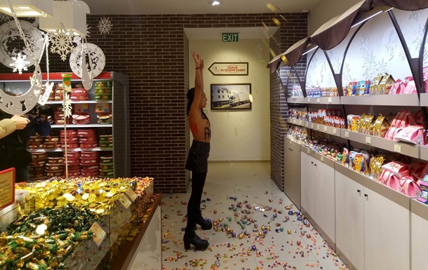Отмечается, что девушка ворвалась в магазин с обнаженной грудью и с надписями "Black Friday, Sale Roshen!". Она разбрасывала конфеты и швыряла торты.