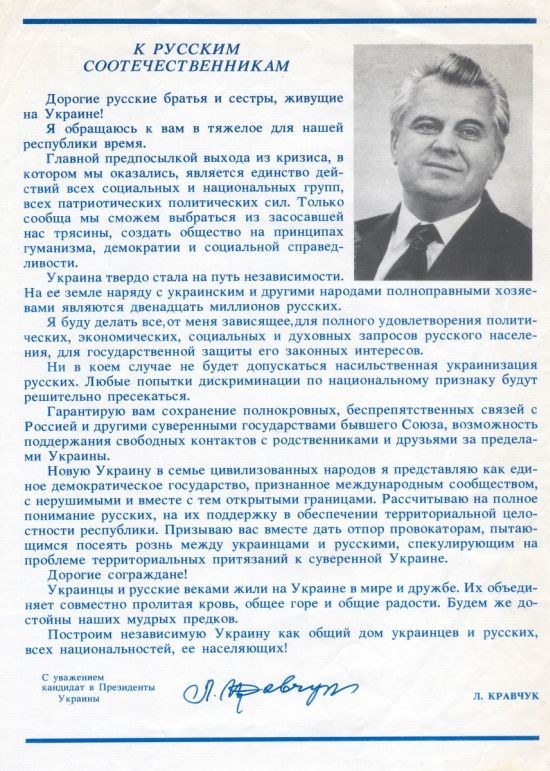 В тот же день 1 декабря первым президентом самостийной Украины был избран второй секретарь ЦК КПУ Леонид Кравчук. А какие листовки он тогда раздавал, как обещал русским на Украине все блага…