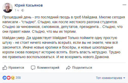"Нет, я выходил за другую Украину. Смотрите, два раза подряд я стоял на Майданах. Два раза я призывал людей выходить на протесты. В 2004 году я вышел в прямой эфир "5 канала", единственного тогда оппозиционного, через полтора часа после того, как ЦИК официально назвал Януковича президентом Украины. Как вы думаете, мне было что терять? Да, я мог потерять все. Но я не мог сидеть дома, я поехал в студию и обратился к людям: "Выходите все! Я не хочу в Россию (напомню, это 2004 год), я хочу в Европу". Два раза я это делал, и два раза грабли мне били по лбу в одну и ту же точку. Ничего не меняется!" – сказал Гордон.