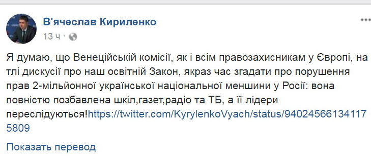 «Я думаю, что Венецианской комиссии, как и всем правозащитникам в Европе, на фоне дискуссии о нашем образовательном Законе, самое время вспомнить о нарушении прав двухмиллионного украинского национального меньшинства в России: оно полностью лишено школ, газет, радио и ТВ, а его лидеры преследуются», — утверждает Кириленко.