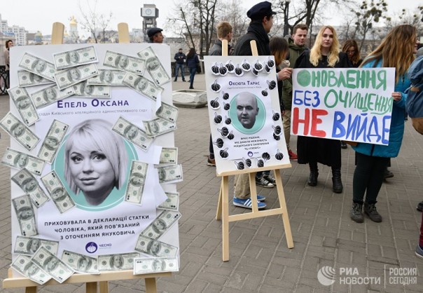 Участники акции "Аллея недобропорядочных", направленной против коррупции в судебной системе Украины, в Киеве