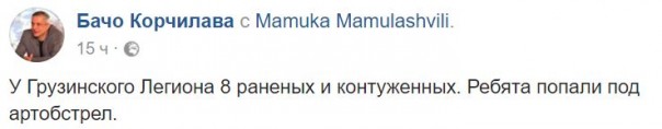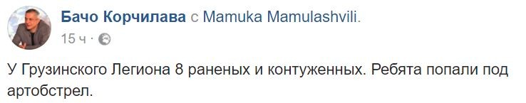 «У Грузинского Легиона 8 раненых и контуженных. Ребята попали под артобстрел», — написал на своей странице в соцсети экс-пресс-атташе посольства Грузии Бачо Корчилава.