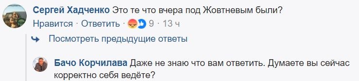 «Это те, что вчера под Жовтневым были?» — написал он, имея в виду штурм сторонниками Саакашвили Октябрьского (Жовтневого) дворца на улице Институтской в Киеве. При столкновениях с Нацгвардией там были пострадавшие.