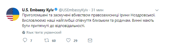 «Потрясены и опечалены убийством правозащитницы Ирины Ноздровской. Выражаем наши глубочайшие соболезнования близким и родственникам. Виновные должны быть привлечены к ответственности», — говорится в сообщении.