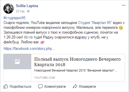 «В связи с дискуссией, которая развернулась в социальных сетях касательно одной из миниатюр новогоднего выпуска «Вечернего квартала» от студии «Квартал 95», телекомпания «1+1» хотела бы разъяснить некоторые моменты. Действительно, имели место, на наш взгляд, эпизоды, которые могли вызвать обвинения в неуважении к сексуальным меньшинствам. Приносим извинения за этот эпизод и заверяем, что у нас не было никакого намерения оскорбить кого-либо. Телеканал «1+1» изъял этот эпизод из своей библиотеки.