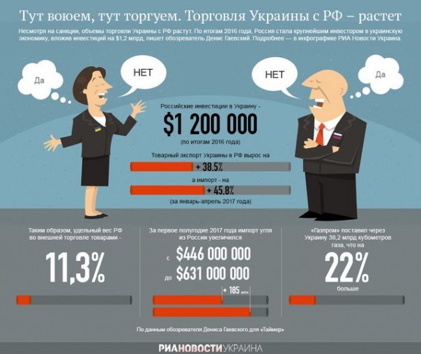 Но у российской статистики – другие данные: «Оборот внешней торговли между Россией и Украиной в январе-октябре 2017 года составил 10,111 миллиарда долларов, показав рост на 23,1% в годовом выражении, свидетельствуют данные Федеральной таможенной службы (ФТС) РФ. Экспорт из РФ на Украину составил 6,216 миллиарда долларов (рост на 21,8%), импорт РФ из Украины — 3,896 миллиарда долларов (рост на 25,2%)». То есть, почти в два раза больше (да, понятно, что в первой ссылке – за 8 месяцев, а во второй – за год, но всё равно видно, что темпы роста отличаются в большую сторону».