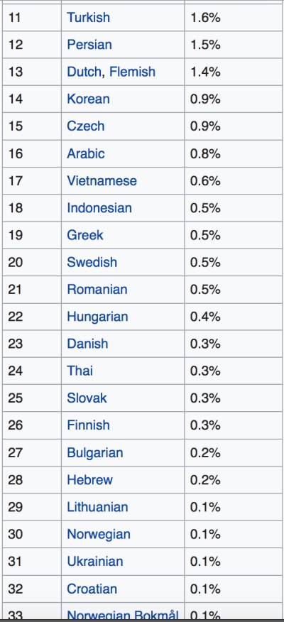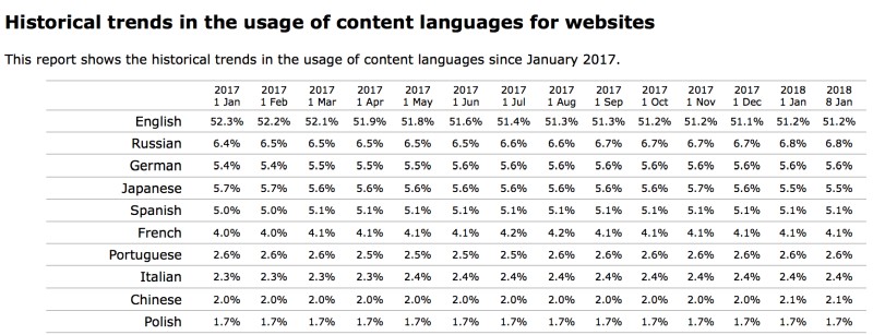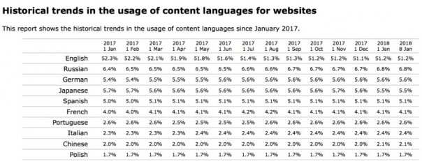 По данным «W3Techs» в результате анализа 10 000 000 сайтов, находящихся в верхних позициях по посещаемости в Интернет, распределение по языковому контенту выглядит так: