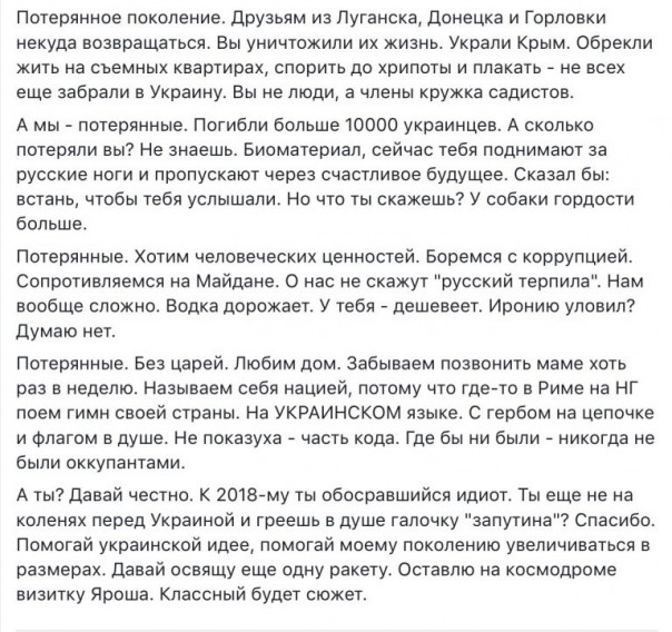 И, да! Просто для чистоты понимания. Россиянам в основной массе плевать на Украину и её молодое поколение. Просто потому, что они живут своими интересами. В которых украинцы воспринимаются исключительно как весьма проблемные соседи, внезапно ставшие весьма агрессивными, неприятными и неудобными.