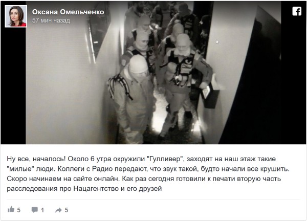 Об этом сообщила в фейсбуке главный редактор газеты "Вести" и сайта Vesti-ukr.com Оксана Омельченко. "Ну все, началось! Около 6 утра окружили "Гулливер", заходят на наш этаж такие "милые" люди. Коллеги с Радио передают, что звук такой, будто начали все крушить. Скоро начинаем на сайте онлайн. Как раз сегодня готовили к печати вторую часть расследования про Нацагентство и его друзей", - отметила она.