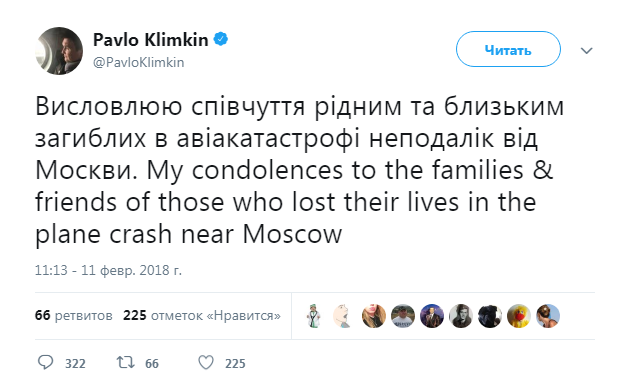 «Выражаю соболезнования родным и близким погибших в авиакатастрофе недалеко от Москвы», - написал Климкин на украинском и английском языках.
