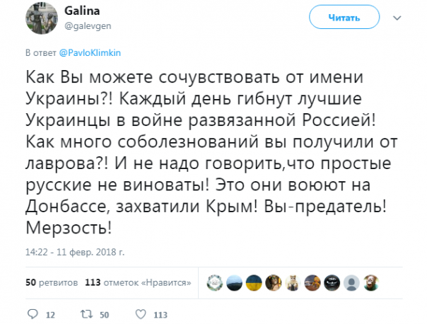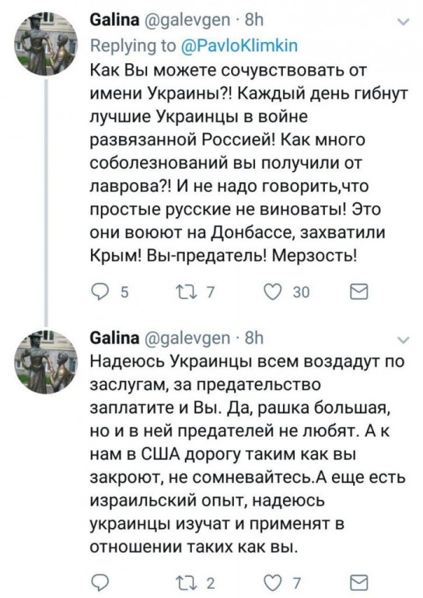 Украинские подписчики Климкина в «Твиттере» осыпали его оскорблениями, они возмутились тем, что министр проявил человеческие чувства. Здесь собраны лишь некоторые из комментариев (стилистика и орфография сохранены):