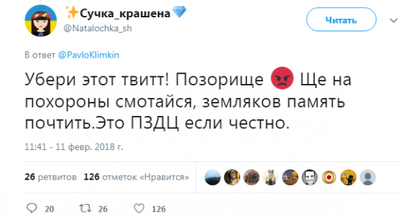 «Убери этот твитт! Позорище Ще на похороны смотайся, земляков память почтить. Это ПЗДЦ если честно».