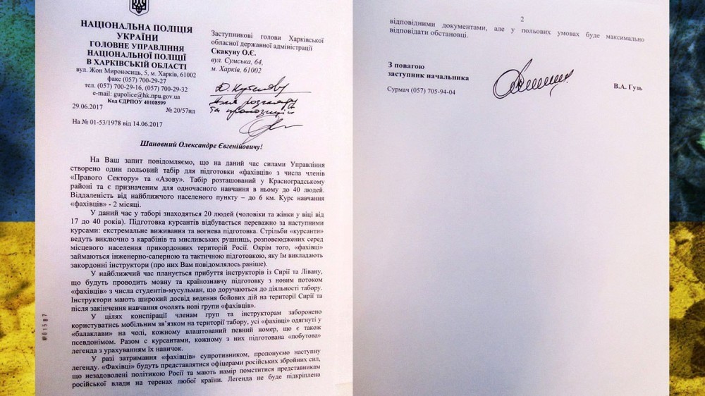 Активисты из харьковского русского сопротивления смогли получить документы от 26 июня 2017 года, в которых прямым текстом написано о создании лагерей для обучения бойцов из батальонов «Азов» и «Правый сектор». В бумаге указано, что на Украину ожидается прибытие студентов-мусульман, а также специальных инструкторов из Ливии и Сирии, которые и будут готовить «спецов». В документах особо отмечается, что лагерь находится в лесах Красноградского района, в 6 километрах от ближайшего населенного пункта. В общем, подальше от цивилизации в целях конспирации.