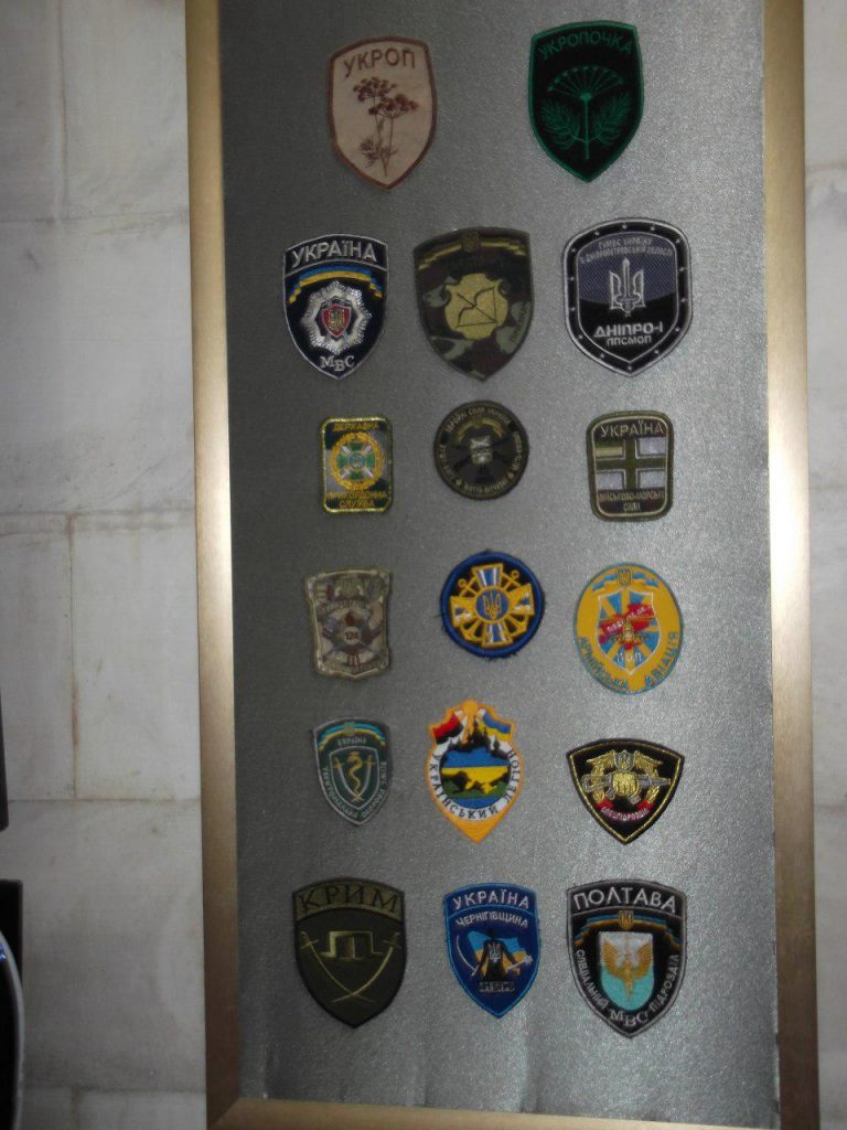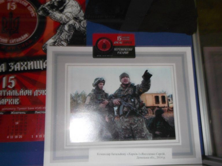Наполнен зал на основе выставок, проходивших здесь ранее. На первой из них, открывшейся 6 июня 2015 года, особо отмечались каратели-добровольцы и волонтёры. Вот что тогда сообщал тот же сайт облгосадминистрации: «Основное внимание уделяется именно военным-землякам, которые сейчас находятся на передовой. Среди них — выпускники исторического факультета Харьковского национального университета имени В. Н. Каразина, которые стали бойцами добровольческого полка «Азов» Национальной гвардии Украины — командир полка Андрей Билецкий, его заместители Олег Однороженко и Вадим Троян — выпускник Харьковского национального университета внутренних дел, отмечают организаторы.