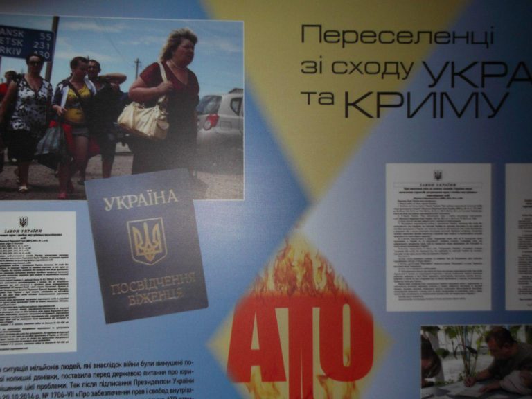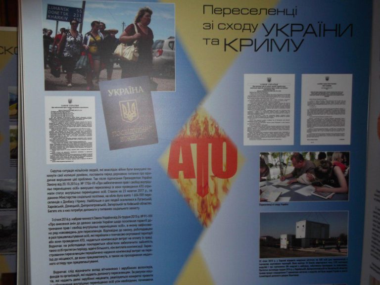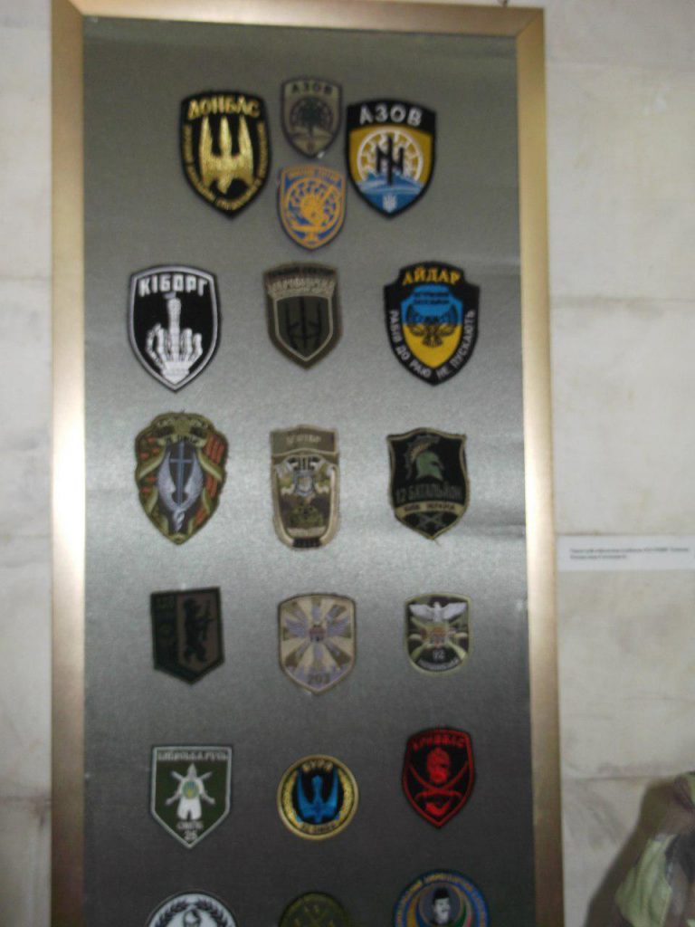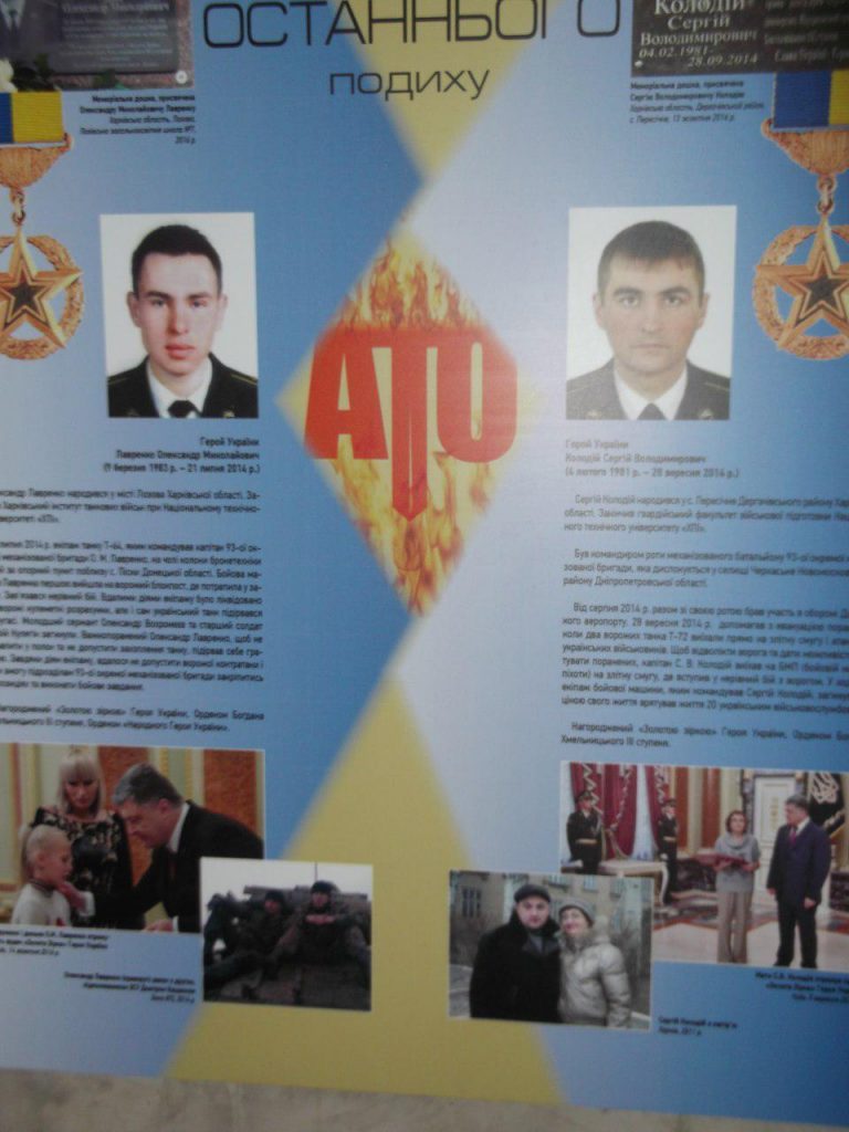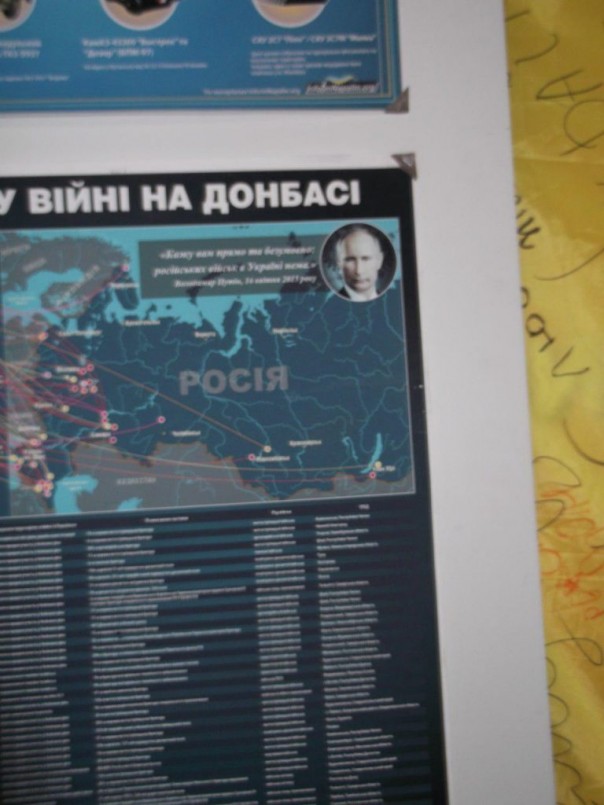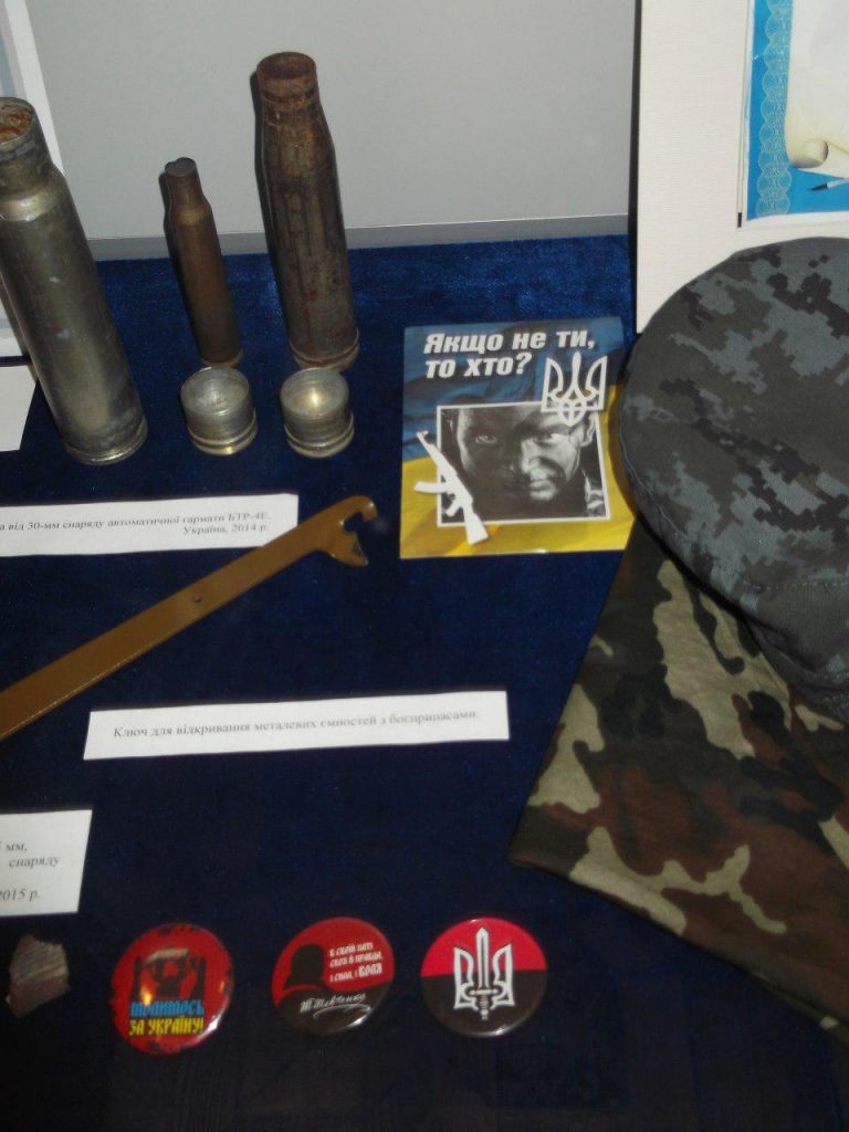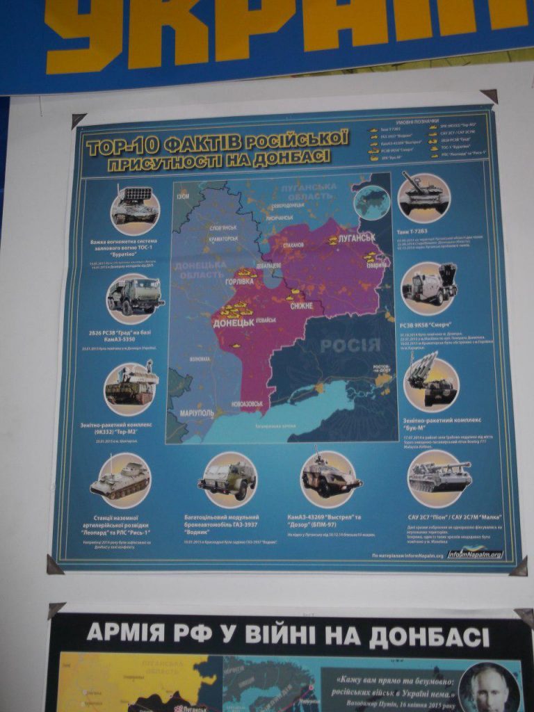 Цель выставки также — почтить память погибших бойцов батальона «Донбасс» Национальной гвардии — Эдуарда Ушакова, Кадыра Магомедова и еще десятков героев-земляков из разных подразделений, участвовавших в АТО». Сейчас этого в зале нет, но хватает плакатов с «доказательствами российской агрессии».