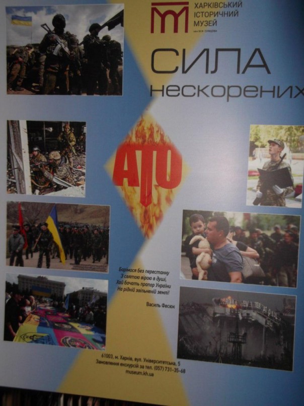 На днях в Харьковском историческом музее им. Сумцова открылась выставка «Сила непокоренных», посвященная карательной операции на востоке Украины. Открылась на лестничной клетке третьего этажа перед входом на основную экспозицию. Ее обещают сделать передвижной и повозить по районам области.