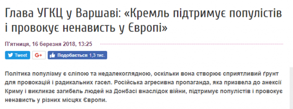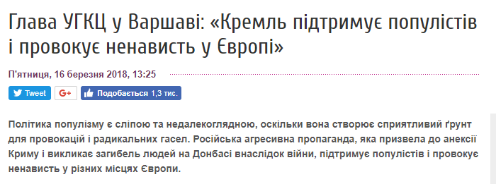 Главарь «украинской греко-католической церкви» Святослав (Шевчук) в Варшаве заявил, что правосеков и прочих националистических отморозков на Украине спонсирует… Кремль. Даю перевод: «Кремль финансирует экстремальных националистов и поддерживает конфликты. Он делает это в Украине и Польше, а также во Франции и Греции». Простите, но похоже на то, что раскольники разума совсем лишились: то у них Россия – отсталая страна, которая вот-вот развалится, то наоборот – вездесущая и всемогущая.