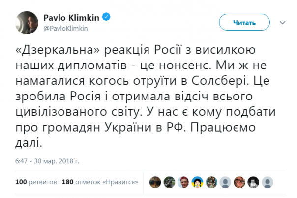""Зеркальная" реакция России с высылкой наших дипломатов - это нонсенс. Мы же не пытались кого-либо отравить в Солсбери. Это сделала Россия и получила отпор всего цивилизованного мира. У нас есть кому позаботиться о гражданах Украины в РФ. Работаем дальше", - написал Чугункин.